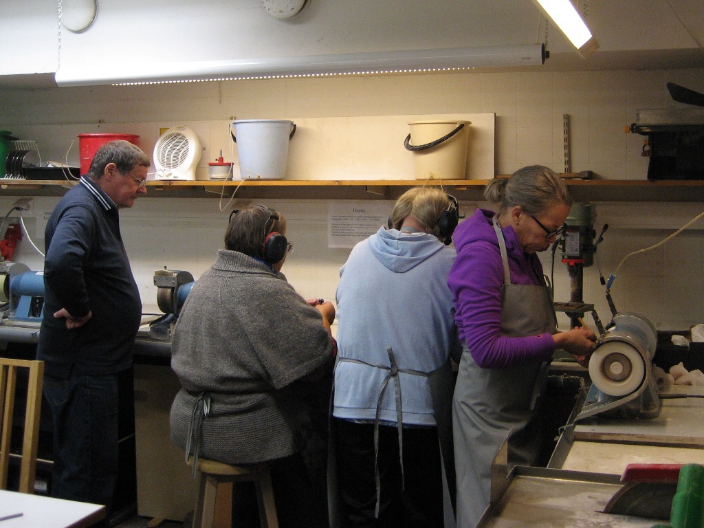 Taas iski tauti: kurssin jo alettua saimme tekstiviestin, että toinen helsinkiläinen on sairastunut ja kaverikaan ei pääse tulemaan, kun piti tulla sairastuneen kyydissä. Onneksi espoolaiset pääsivät tulemaan. Ja tykästyivät kivenhiontaan niin paljon, että halusivat liittyä jäseneksi jo ensimmäisenä kurssipäivänä.