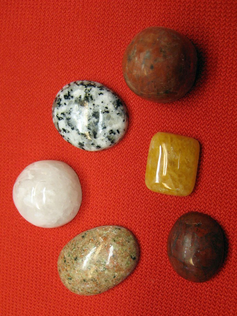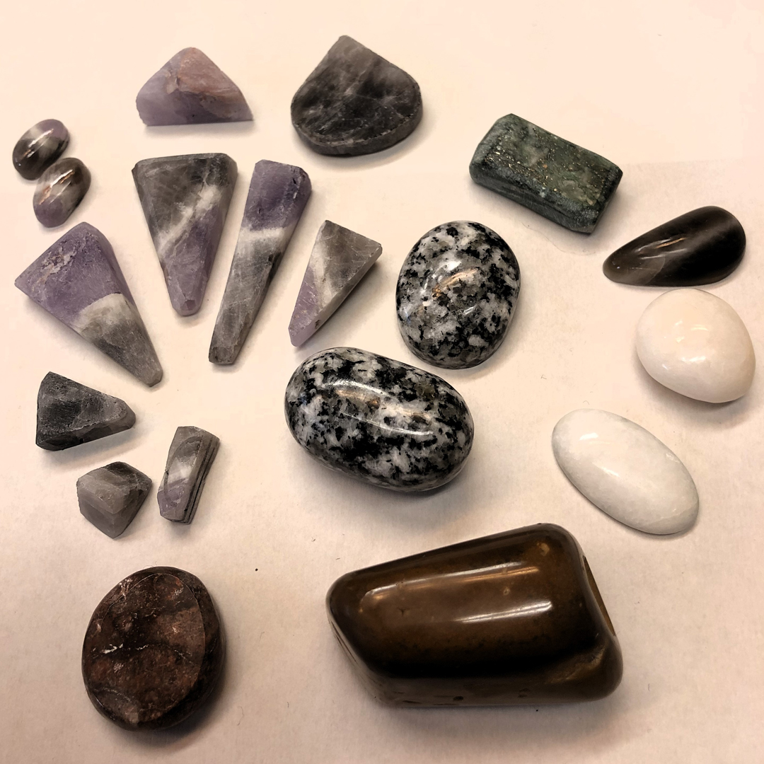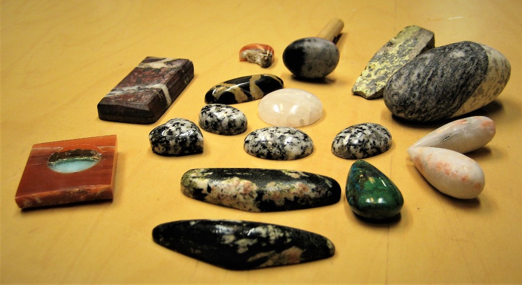 Pakollisen Ristijärven graniitin jälkeen hiottiin mm. amatsoniittia, ametistia, kromimarmoria, kvartsia, porfyyriä, jaspista, serpentiiniä… ja todella mielenkiintoista norjalaista rullakiveä. Joka kurssilla opettajatkin oppivat jotain uutta. Ahkeran googlauksen jälkeen opimme, että yhden kurssilaisen tuomat rullakivet ovat kvartsiittia. Mahtava kiilto tuli näihin upeisiin kiviin.